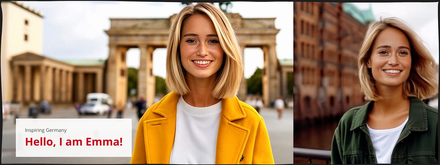 Take this, from the German National Tourist Board, no less. Emma is (unabashedly) “an AI travel influencer”, billed as an “innovative, interactive brand ambassador” created to convince travelers to visit Germany. While she is apparently more a chatbot than anything else, the pitch seems to be that she is the first of other ‘influencers’ planned, and is-of course- on Instagram. Forbes has a good report here.