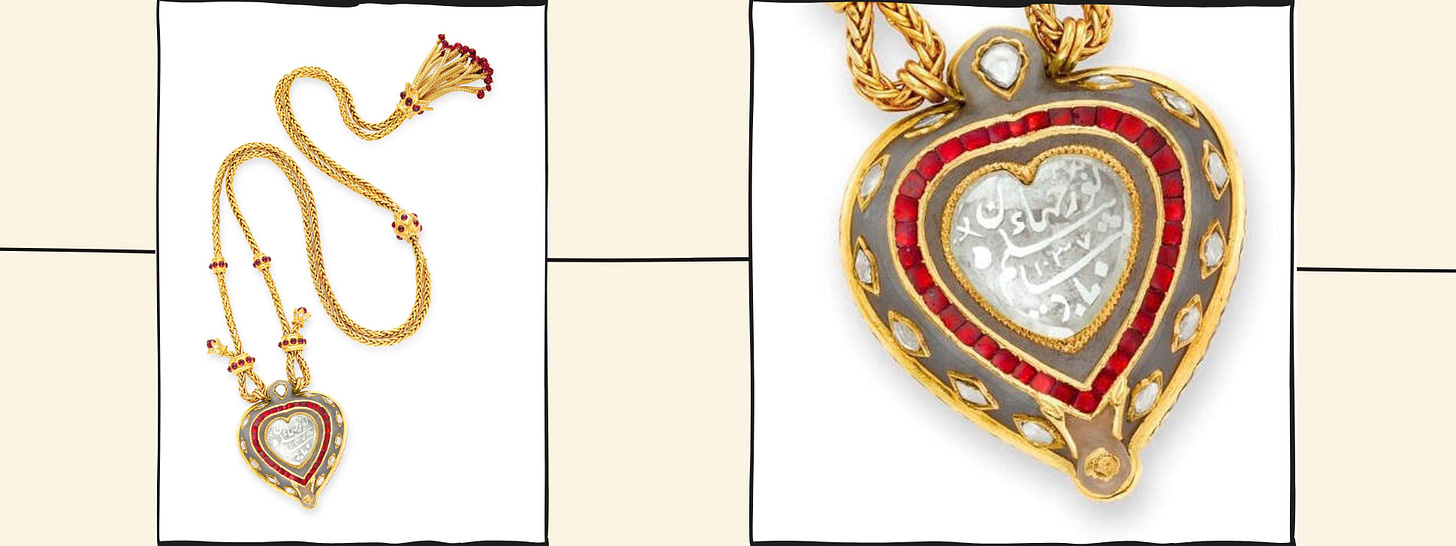 Also around this time, an exquisite gem is crafted– a heart-shaped, table-cut diamond. A pendant suspended by two silk chords tied around the neck, its flat surface inscribed with Persian nasta‘liq (a calligraphic hand):